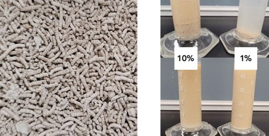 Figure 2. Beauveria bassiana extruded WDG (left) and diluted formulations in 10% or 1% dilution.