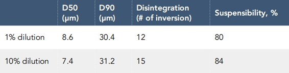 AltaBio™ is designed specifically to address challenging biological formulations and hard-to- formulate conventional. Beauveria bassiana is an extremely hard to formulate, hydrophobic biological species. Using 1% AltaBio™ 200 as the only dispersant delivers granular product that can easily disintegrate in water at 1% or 10% dilution ratio (seen in Figure 2), meaning the water use quantity can be effectively cut down to only 1/10 of its original rate. With only 1/10 water being used in the diluted product, the resulting suspension has very similar particle size, and even slightly higher suspensibility comparing to the 1% dilution, shown in Table 1. In addition, Beauveria bassiana extruded water dispersible granules (WDG) with AltaBio™ 200 provides very high suspensibility (>80%) at only ¼ use rate of industrial benchmarks, including sulfite lignosulfonate and styrene acrylate copolymer and provides faster granular disintegration comparing to alternates.