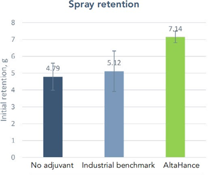 Figure 3. Initial retention of AltaHance™ vs. Industrial benchmark adjuvant on soybean.