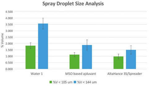 AltaHance™ also doesn’t negatively impact spray drift. Methylated soybean oil (MSO) was compared to AltaHance™ in terms of droplet size distribution at University of Dayton wind tunnel under the following test conditions: 15mph wind speed, standard nozzle set Teejet 8008 flat fan (coarse/very coarse), 35-40 psi (compliant to ASABE standard), 10 inches distance to measurement beam, and measurements in triplicates. Drift test result is shown in Figure 4.